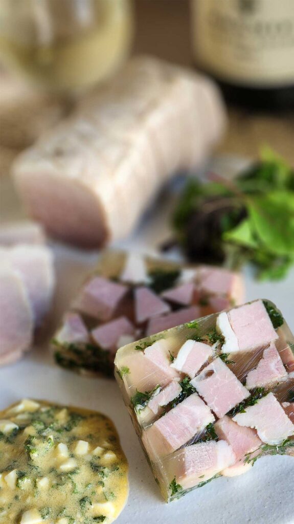 カットしたハムとパセリを合わせてゼリー寄せする「ジャンボン・ペルシエ」