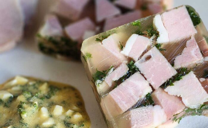 カットしたハムとパセリを合わせてゼリー寄せする「ジャンボン・ペルシエ」